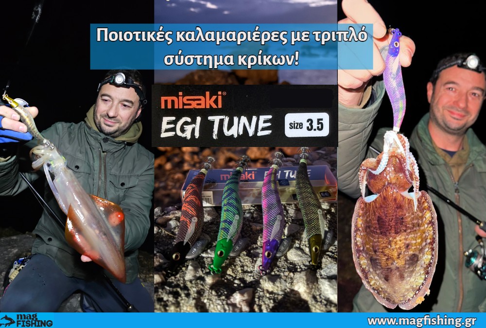 Με τις Misaki Egi Tune πιάσαμε αρκετά καλαμάρια όλο αυτό το διαστημα που κάναμε τις δοκιμές μας, σε διαφορετικούς τόπους, αλλά πήραμε και μεγάλες σουπιές. Είναι ωραίο να έχεις πολυχρηστικές καλαμαριέρες στην κασετίνα σου, και να μην αναγκάζεσαι να κουβαλάς μαζί σου δεκάδες διαφορετικές καλαμαριέρες , για να καλύπτεις όλες τις καταστάσεις. Τα χαρακτηριστικά των Misaki Egi Tune ανήκουν στην premium κατηγορία των καλαμαριέρων, αντανακλώντας την ποιότητα κατασκευής τους. Θα ανήκουν για πάντα μέσα στις κασετίνες μας! Οι Misaki είναι νέα εισαγωγή , υπάρχει όλο το χρωματολόγιο διαθέσιμο, η αντιπροσώπευση και η διανομή για Ελλάδα και Κύπρο γίνεται από τον καλό ψαρά και φίλο Κωνσταντίνο Λυκογεώργο, και το κατάστημα ειδών αλιείας στην Πάτρα, το Skoukios Fishing. Ο Κωνσταντίνος είναι καλός γνώστης του ψαρέματος και θα χαρεί να σας βοηθήσει σε όλες σας τις αγορές.